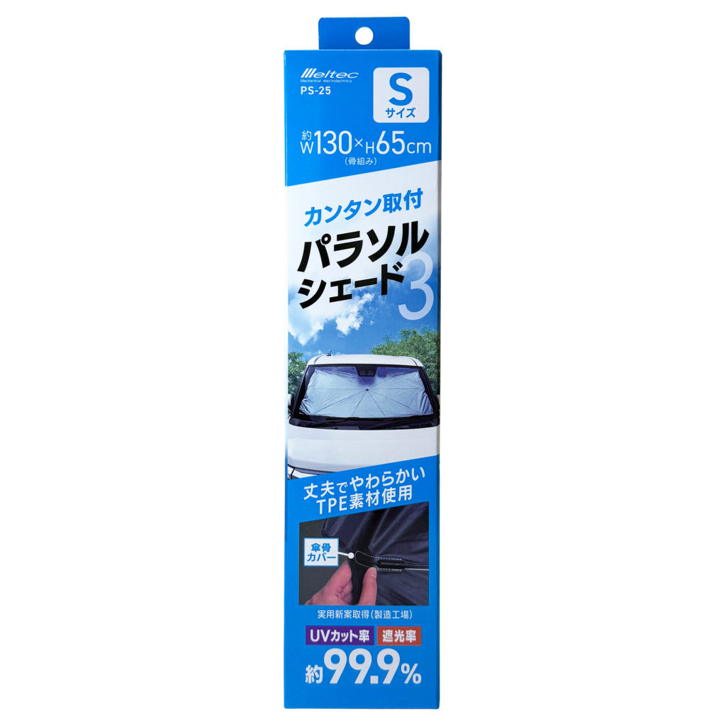 PS-25パラソルシェード3 Sサイズ UVカット・遮光率 約99.9% 車内を傷つけにくいTPE素材の傘骨カバーを使用 取扱説明書適合目安表 材質 シャフト:TPE 骨組み:鉄 シェード生地:ポリエステル+シルバーコーティング(表側) 収納袋:PUレザー 本体サイズ(骨組み) 約1300(W)×650(H)mm 重さ 約420g(収納袋含む) パッケージサイズ 約80(W)×370(H)×75(D)mm アウトカートンサイズ 約480(W)×380(H)×430(D)mm アウトカートンの重さ 約16.5kg カートン入数 30 JANコード 4906918211476 カテゴリ一覧へ