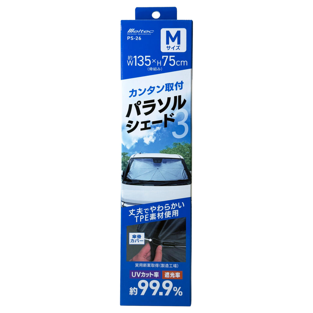 PS-25パラソルシェード3 Mサイズ UVカット・遮光率 約99.9% 車内を傷つけにくいTPE素材の傘骨カバーを使用 取扱説明書適合目安表 材質 シャフト:TPE 骨組み:鉄 シェード生地:ポリエステル+シルバーコーティング(表側) 収納袋:PUレザー 本体サイズ(骨組み) 約1350(W)×750(H)mm 重さ 約440g(収納袋含む) パッケージサイズ 約80(W)×370(H)×75(D)mm アウトカートンサイズ 約480(W)×380(H)×430(D)mm アウトカートンの重さ 約17.5kg カートン入数 30 JANコード 4906918211483 カテゴリ一覧へ